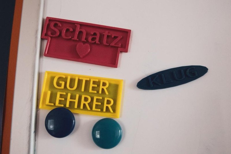 The 3D printer quickly became a valuable educational tool across multiple subjects. One standout project involved students designing custom board magnets for teachers. This activity combined communication, geometry, design thinking, and iterative problem-solving.