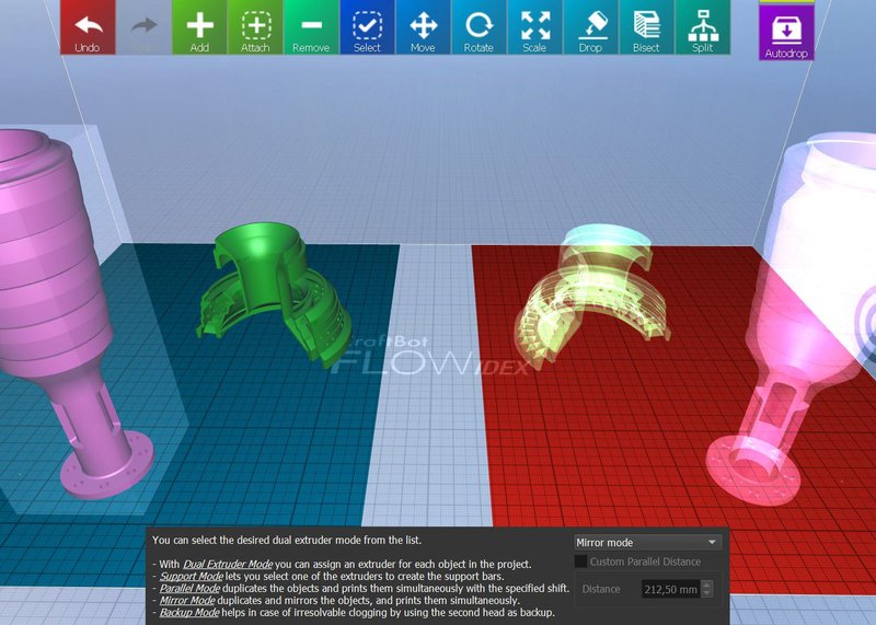 With the filament monitoring sensor, you can avoid any material problems or damage. The device boasts an independent dual extrusion system with two standard 0.4 mm nozzles to print multicolor and multi-material objects in mirror or parallel mode, doubling your productivity.