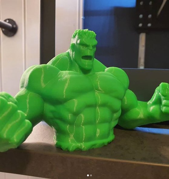 A Hulk model by polyalkemi. It was printed with a 0.6 mm nozzle and 0.3 layer thickness. As is seen from the picture, the surface finish is nice despite the size of the nozzle. The filament used is Smartfil Chlorophyll Green.