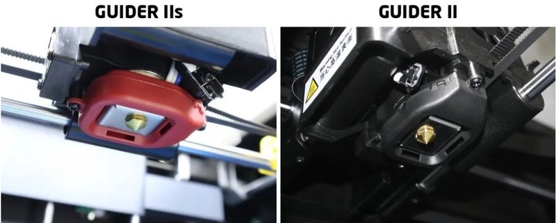 The maximum operating temperature of the Guider IIs extruder reaches 300 °C, while the Guider II has a limit of 240 °C.
