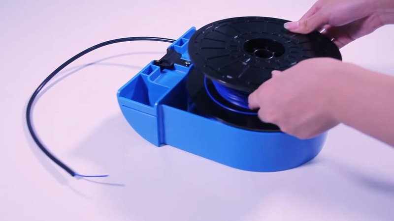 Then, insert the filament into the guide tube and push the tube through the outlet. Lift the filament cartridge from the rear side of the machine and insert a filament spool inside. Place the cartridge back on.
