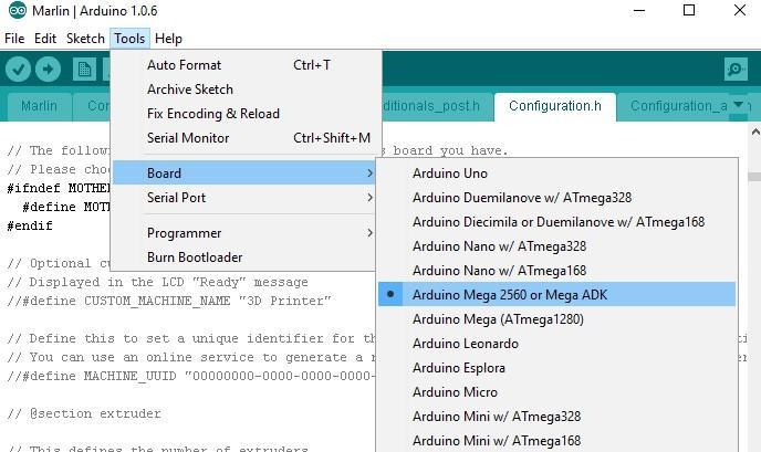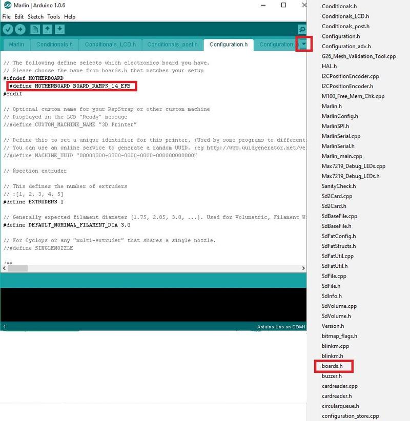 Let's start by choosing your controller (MOTHERBOARD). The list of controllers is available in the boards.h tab. Click on the triangle icon in the upper right corner and select boards.h.