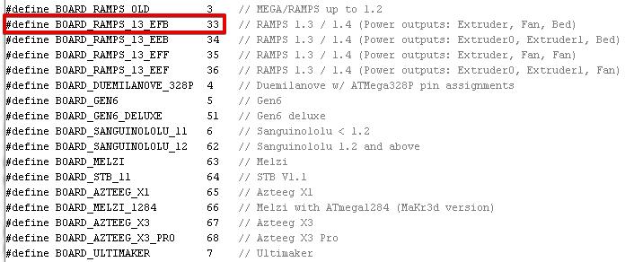 So, we need to replace the “MOTHERBOARD BOARD_ULTIMAKER” line with “MOTHERBOARD BOARD_RAMPS_13_EFB” in configuration.h.