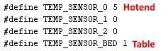 Next you’ll need to select the temperature sensor – choose thermally sensitive resistor. You can see a large list called “//// Temperature sensor settings”. In this particular case, we have an E3D-v5 hotend and a Chinese thermal resistor on the table. For E3D-v5 we select “// 5 is 100K thermistor - ATC Semitec 104GT-2”, for the table – “// 1 is 100k thermistor - best choice for EPCOS 100k”. You can select 1 if you don’t know the type of the thermal resistor. You’ll be able to select any of them and try them out if the temperature is not to your liking. We're changing the values.