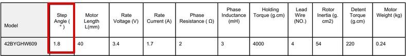 We can find the needed specs (data sheets) for installed stepper motors, in which we see that the shaft rotates 1.8 degrees in one step, which means 360/1.8=200 steps per full revolution. This parameter is the same for most home 3D printers stepper motors.