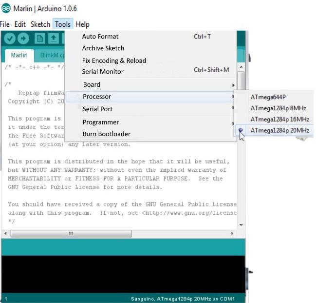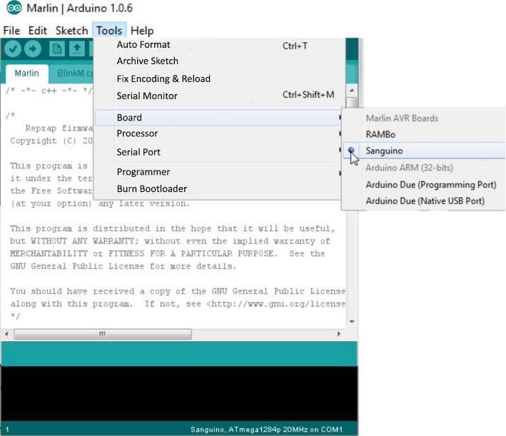 In order to be able to select the desired board in Arduino IDE, you first need to copy everything from the firmware folder “Marlin-DevelopmentArduinoAddonsArduino_1.5.xhardwaremarlinavr” to the Arduino IDE folder at “C: Program Files (x86) Arduinohardwarearduinoavr”'. This lets you choose the Sanguino board (base board for Melzi) and the desired processor type. We don’t have a Melzi board, so we can’t check its functionality with the software.