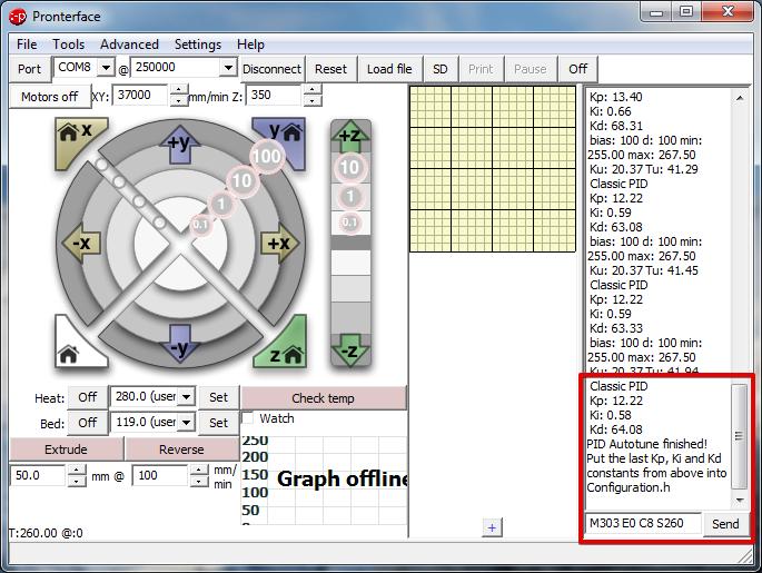 You’ll need to run the PID calibration for heating the hotend and the bed after making sure that everything is working properly. For this, we use Pronterface. Enter the following command: M303 E0 C8 S260, where M303 is the calibration command, E0 is the hotend, C8 is the number of heating-cooling cycles and S260 is the standard nozzle operating temperature.
