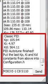 After that, we calibrate the bed PID using the same method. Enter the following command: M303 E-1 C8 S110, where E-1 is the bed and S110 is the standard bed heating temperature. Enter the results in the firmware. Our table heats up very slowly, so we have to restart the command due to a Timeout error.