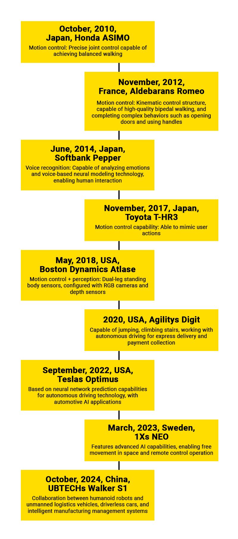 The most recent period (2023-2025) has witnessed rapid innovation and commercial deployment of humanoid robots. In 2023, Sweden's 1X unveiled NEO, featuring advanced AI capabilities that enable free movement and remote operation, with plans to test its Neo Gamma version in hundreds of homes by the end of 2025. In April 2024, Boston Dynamics released an all-electric version of Atlas with broader range of motion and higher dexterity than its hydraulic predecessor. Later that year, China's UBTECH introduced the Walker S1 humanoid robot, which demonstrated groundbreaking integration with unmanned logistics vehicles, driverless cars, and intelligent manufacturing systems. By 2025, humanoid robots have begun real-world deployment at scale, with Agility's Digit robots handling tasks in factories for customers like GXO Logistics, and UBTech's Walker S1 receiving over 500 orders from major manufacturers including BYD, the world's largest electric vehicle maker. This commercialization phase marks a pivotal transition from laboratory research to practical applications, addressing labor shortages and transforming industries through automation.