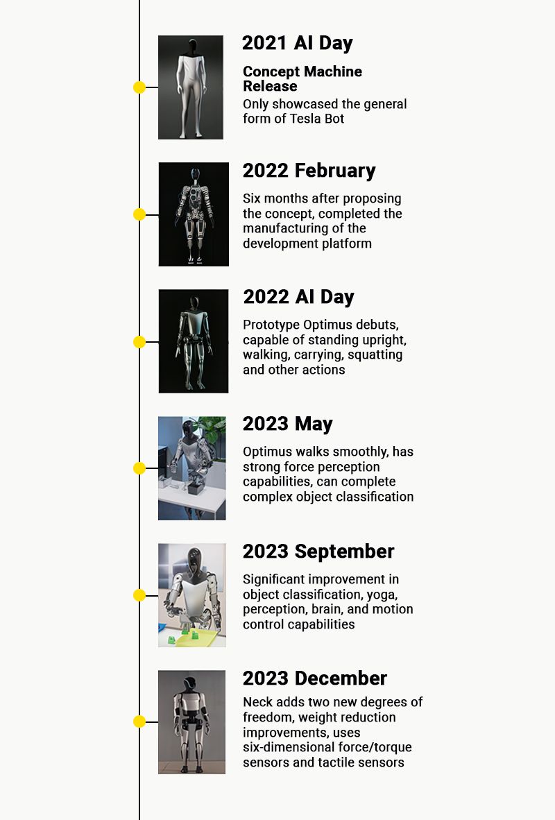 Tesla's Optimus robot has undergone significant evolution since its initial introduction in August 2021. The latest generation Optimus Gen2 features dramatically improved mobility with a natural, human-like walking gait characterized by straight knees, heel-to-toe movement, and natural arm swing. These improvements were achieved through reinforcement learning techniques rather than hard-coded movements, allowing the robot to develop more natural movements through AI training.