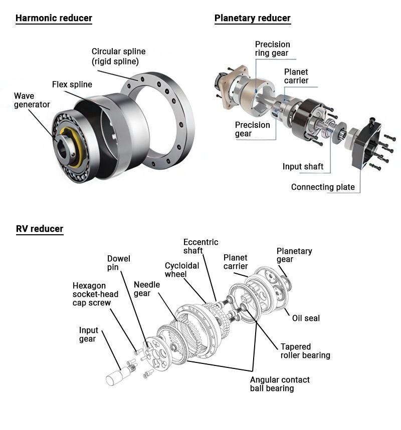 | Composition | Flexible spline, rigid spline, wave generator, etc. | Planetary reducer front stage + cycloidal pin-wheel (trochoidal) reducer rear stage. | Planet gears, sun gear, ring gear, etc. |