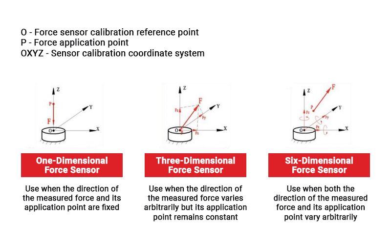 Force sensors are classified according to their measurement capabilities, ranging from one-dimensional to six-dimensional systems. One-dimensional sensors measure force in a single, predetermined direction with a fixed action point, with common examples including load cells and pressure sensors used in simple weight or pressure detection applications. Three-dimensional sensors represent an advancement in capability, simultaneously measuring force components along the X, Y, and Z axes in three-dimensional space. While effective for applications with a fixed action point, these sensors encounter significant measurement errors when force is applied away from the sensor's center, as they cannot compensate for the resulting torque components.