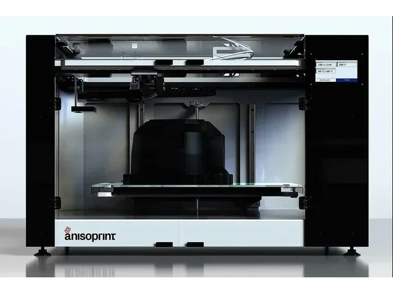 Markforged’s pre-preg approach uses a single filament pre-impregnated with fiber and thermoplastic (e.g., nylon), while Anisoprint’s coextrusion desktop anisoprinting separately feeds fiber and thermoplastic into the print head, enabling adjustable fiber volume ratios and curved reinforcement aligned to stress, such as strengthening holes without added weight.