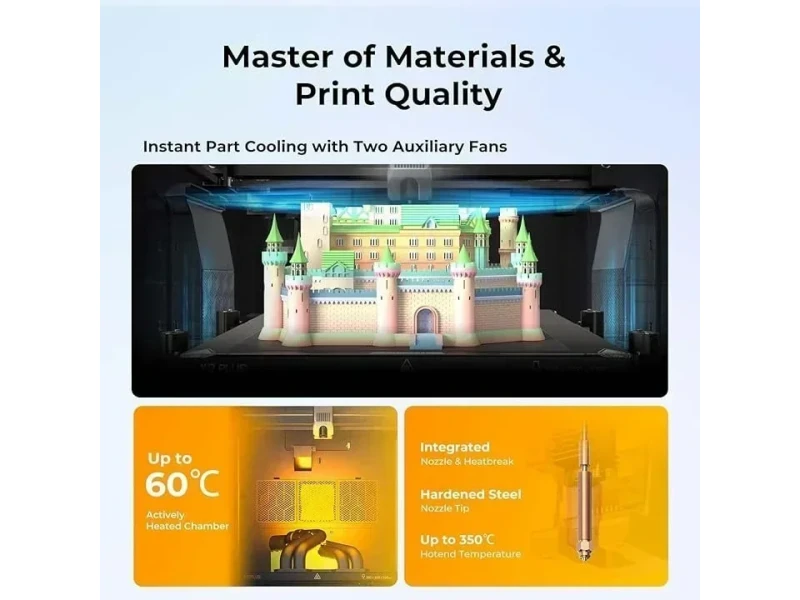 The Creality K2 Plus supports over 12 filament types using advanced thermal management: a 350°C nozzle, 120°C heated bed, and 60°C heated chamber. It handles both standard and engineering-grade materials like PLA, ABS, PA-CF, and PC with precision, enabling prints that usually require specialized equipment.
