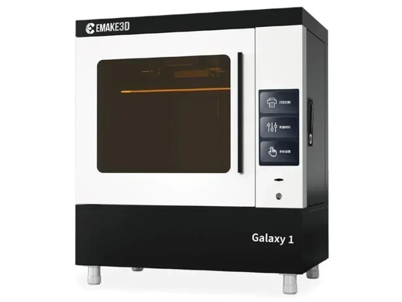 The EMAKE3D Galaxy 1 features a robust all-metal frame with an integrated rack system for stability and vibration reduction, delivering precise prints within its 400 x 200 x 400 mm build volume while measuring 700 x 432 x 803 mm, weighing 57 kg, and operating quietly below 50 dB.