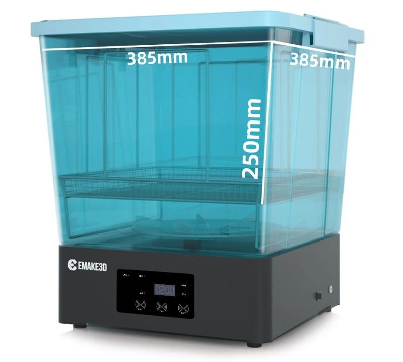 The Emake3D Wash 1 delivers a cleaning volume of 385 x 385 x 250 mm, providing 37.1 liters of washing capacity for resin post-processing operations. This washing chamber accommodates 100% of consumer resin printer builds.