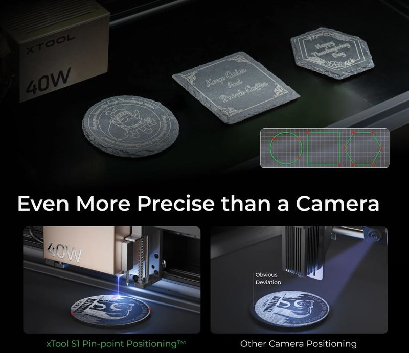 As a new standard for accuracy, the xTool S1 presents an innovative Pin-point Positioning system that utilizes advanced encoders and algorithms to create a precise absolute coordinate layout, displaying the laser module’s position in real time within the software. This ensures a precise replication of the object’s frame, which surpasses camera-based positioning and is free from distortion. There are three ways to align multi-shape objects: Circular, Twin-point, and Polygonal. Apart from this, the S1 model supports positioning multiple objects of different shapes in batches, offering more productivity and flexibility.